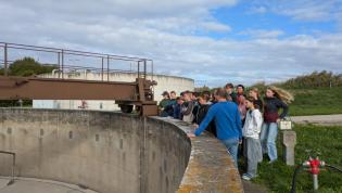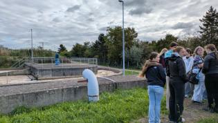 Die nächste Station war ein Belüftungsbecken in welchem Sauerstoff in das Abwasser gepumpt wurde. Das dient zur Aktivierung der Mikroorganismen, welche Phosphate und andere organische Stoffe abbauen. Ein wichtiges Merkwort, das uns vermittelt wurde, war „SCHNOP“, was für Schwefel, Kohlenstoff, Wasserstoff, Stickstoff, Sauerstoff und Phosphor steht. Das sind Elemente, die lebenswichtig und essentiell für biologische Prozesse sind. Außerdem wurde dort Sand im Sandfang abgetrennt. Der Sand wird gereinigt und anschließend wiederverwendet oder verbrannt.